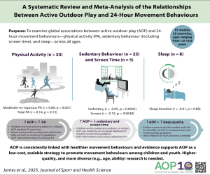 James ME, de Lannoy L, Lopes O, et al. A systematic review and meta-analyses of the relationships between active outdoor play and 24-hour movement behaviors. J Sport Health Sci. Published online December 29, 2025. doi:10.1016/j.jshs.2025.101115